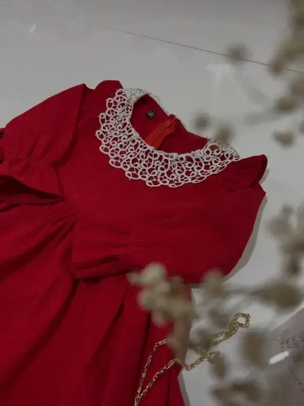 خرید عمده پیراهن دخترانه کبریتی نارگل یقه گیپور قرمز