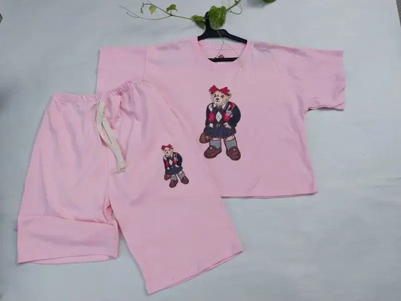 خرید عمده ست کراپ و شلوارک دخترانه طرح خرس نخ پنبه فری سایز مناسب 10 تا 12 سال