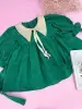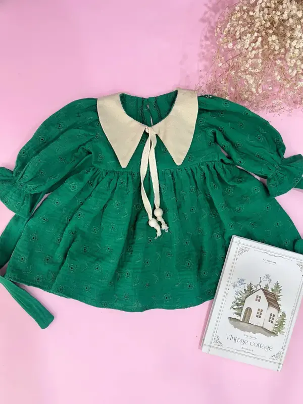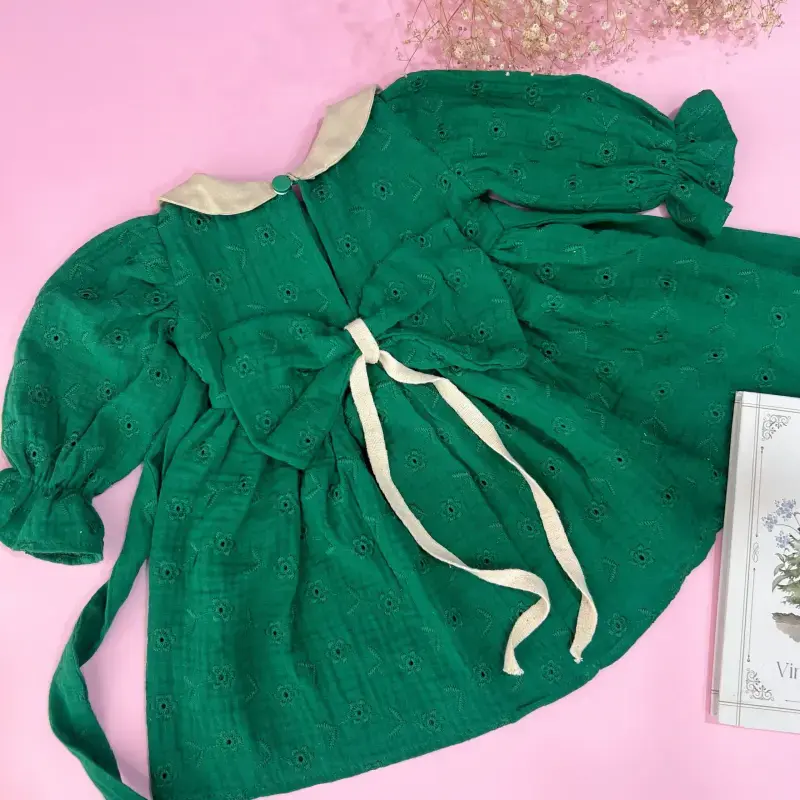 خرید عمده پیراهن دخترانه سبز یقه کرواتی موسلین خامه دوزی