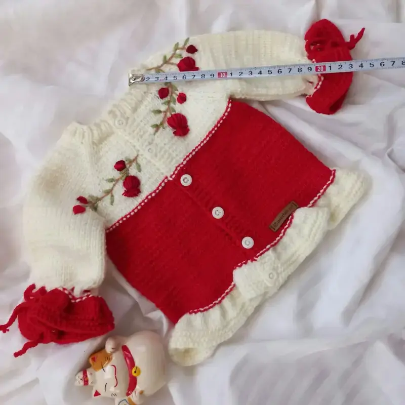 این ژاکت بافتنی نوزادی دخترانه با طرح زیبا و منحصر به فرد انار و گل رز، انتخابی ایده‌آل برای پوشاک زمستانی دلبند شماست. بافته شده با دقت و ظرافت با کاموای نرم، گرم و ضد حساسیت، مناسب برای پوست لطیف نوزادان و کودکان.
