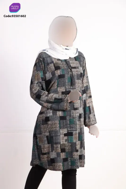خرید عمده تونیک بلند یقه بندی طرح دار زنانه کد 93501602