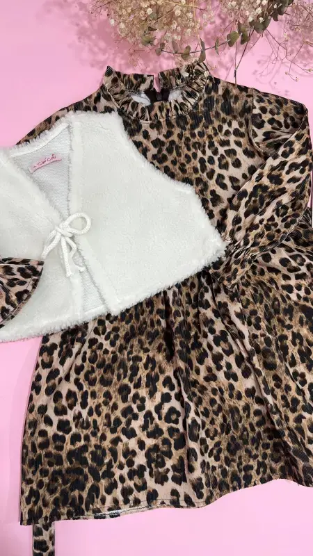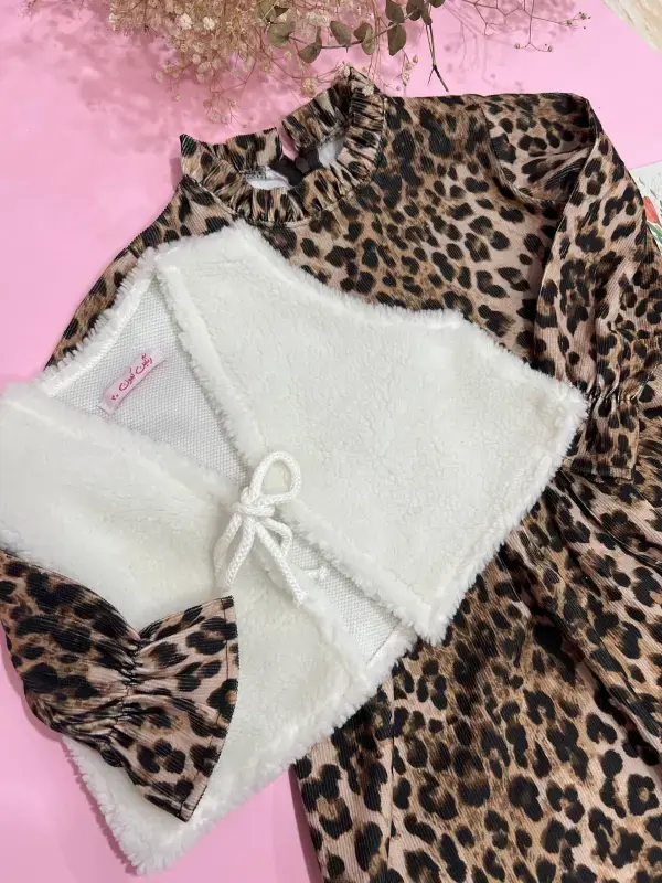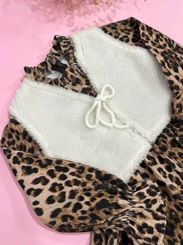 این ست شامل یک پیراهن کبریتی با طرح پلنگی جذاب و یک جلیقه تدی گرم و نرم است که انتخابی ایدهآل برای استایل زمستانی کودکان محسوب میشود.