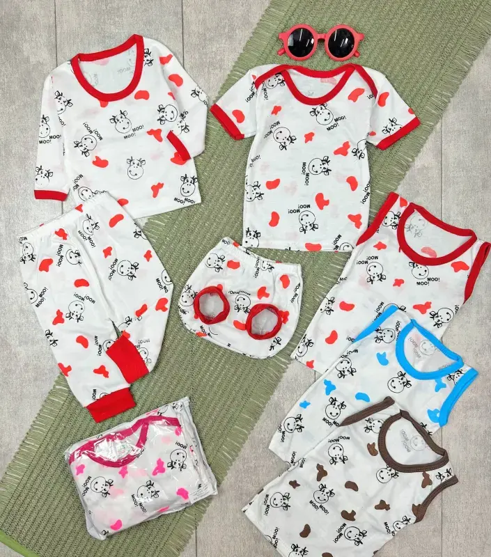 ارائه دهنده لباس پنج تکه نوزادی با طرح جذاب گاو بامزه، مناسب برای تکمیل کلکسیون پوشاک نوزادان شما. این مجموعه با دقت و کیفیت بالا برای فروشندگان پوشاک و بوتیک داران طراحی شده است.