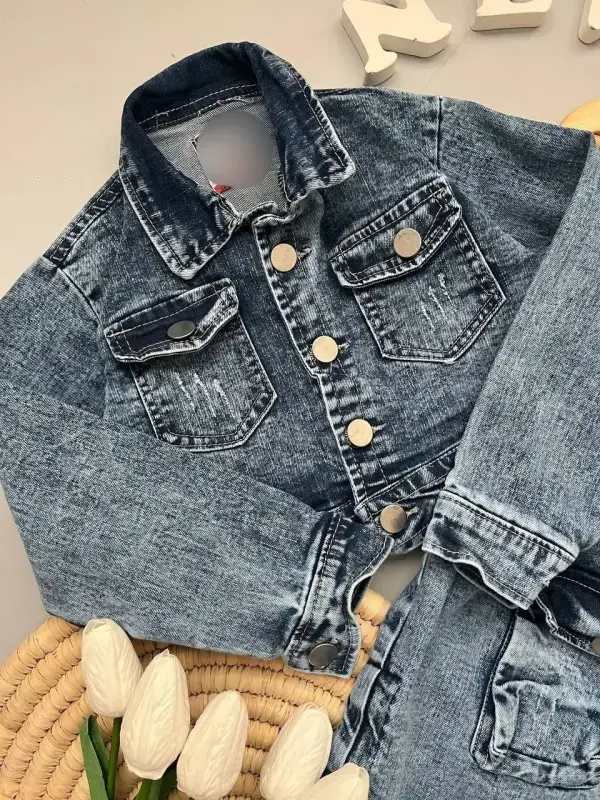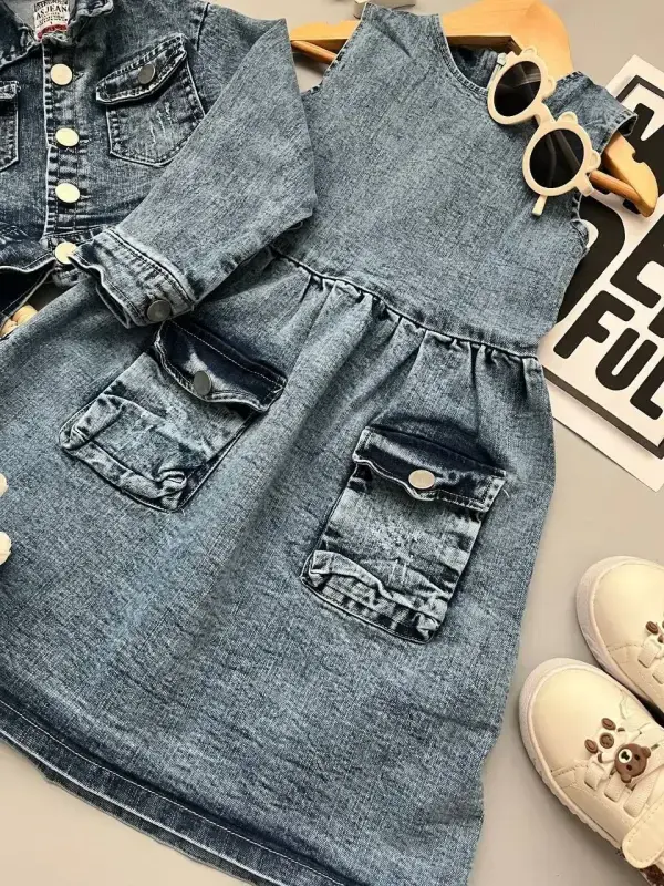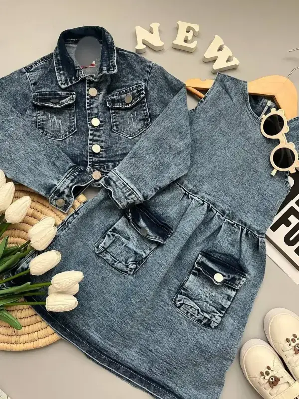 این ست جین دخترانه، گزینهای جذاب برای خرید عمده پوشاک دخترانه است. با توجه به طراحی و کیفیت، میتواند به فروش شما رونق بخشد. برای خرید عمده ست کت و سارافون جین، این محصول را در نظر بگیرید.