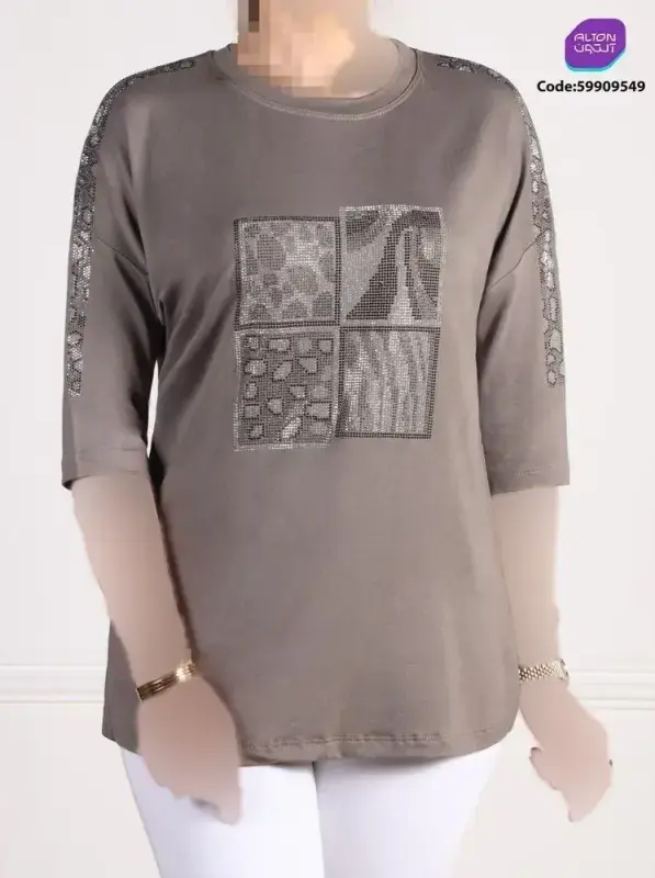 تیشرت زنانه قواره بزرگ آستین سه ربع طرح پلنگی با تزئین نگین