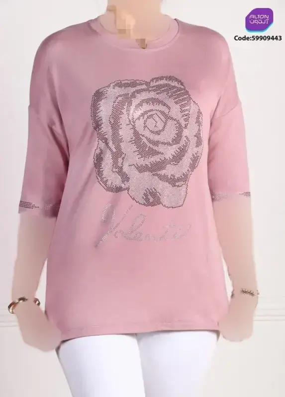 خرید عمده تیشرت زنانه آستین سه ربع طرح گل و نگین کد 59909443