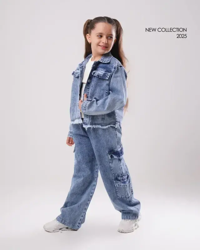 ست سه تیکه کت و شلوار جین کارگو دخترانه کالکشن عیدانه ۱۴۰۳