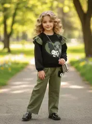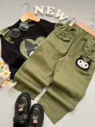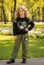 بلوز شلوار دخترانه طرح کیتی سبز و کرم